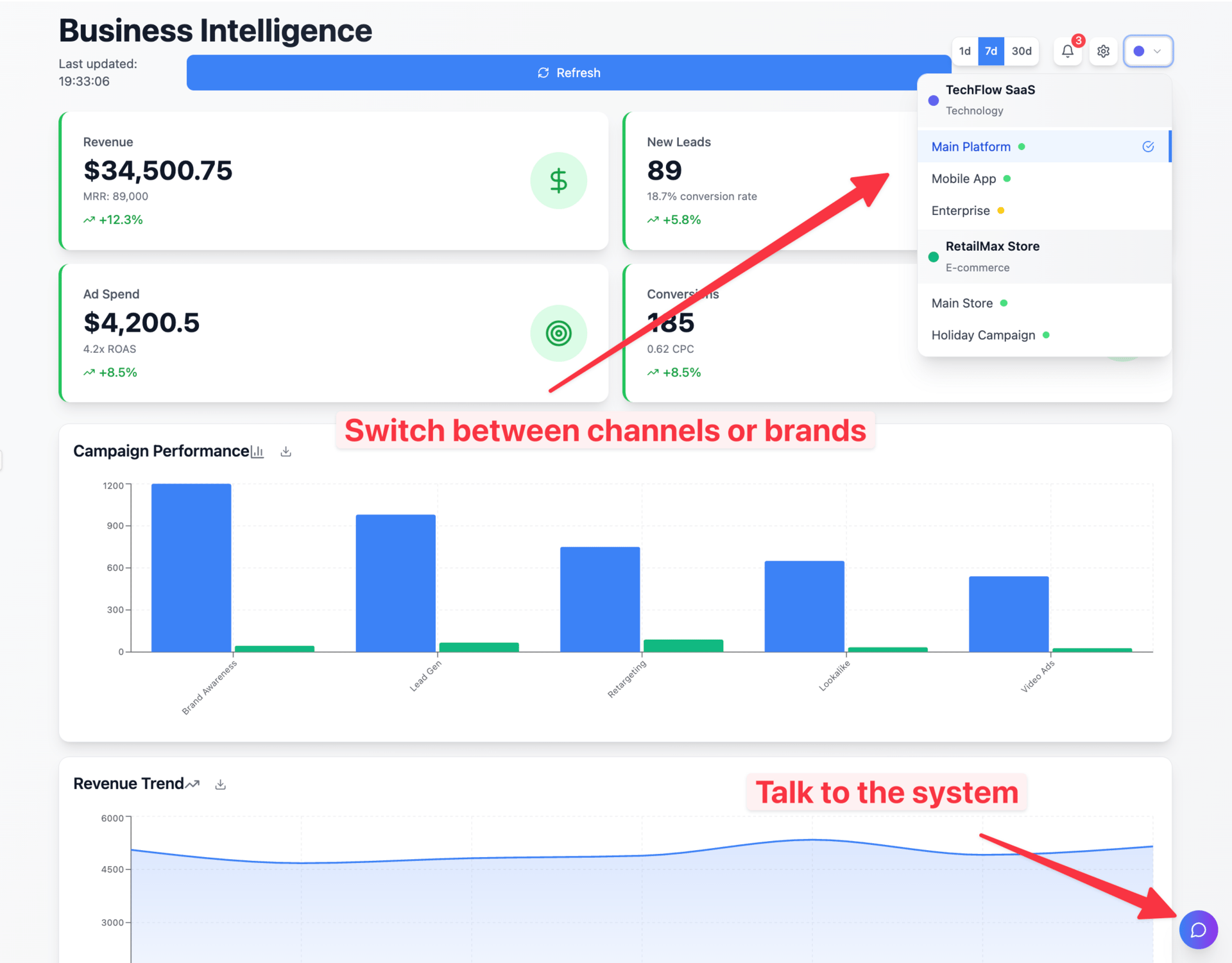 Instead of switching between different AI tools, you get one intelligent assistant that has access to all your business data and can perform real actions.